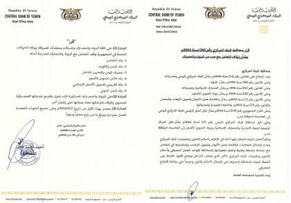 انطلاقاً من المسؤولية الدستورية والقانونية التي أنيطت بالبنك المركزي في إدارة السياسة النقدية، واستناد اً إلى أحكام المواد (24 – 26) من قانون البنك المركزي اليمني رقم (14) لسنة 2000 م المعدل بالقانون رقم (21) لسنة 2003م.